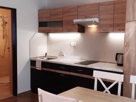 | Kuchyně: | samostatná kuchyňský kout teplá a studená voda el. chladnička mrazák mikrovlnná trouba varná konvice |