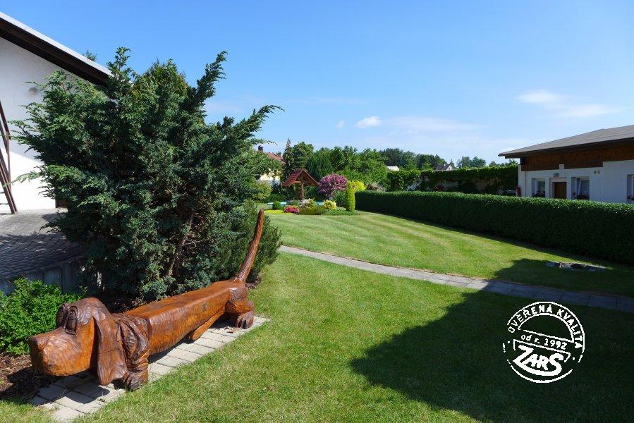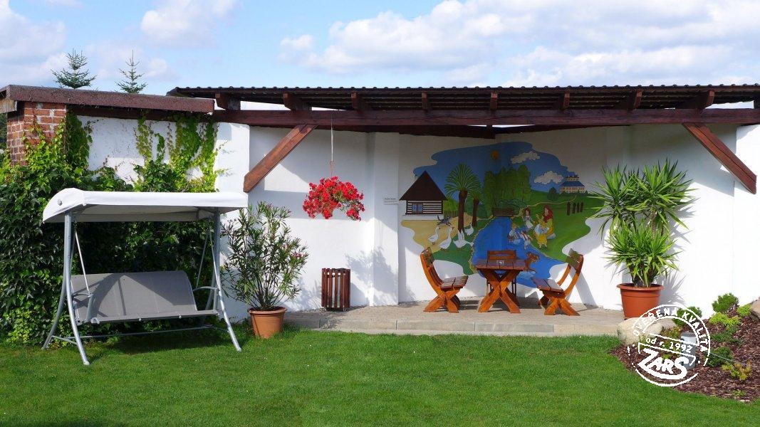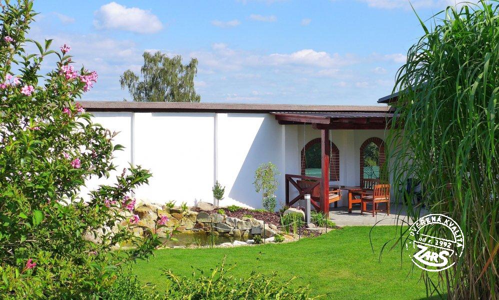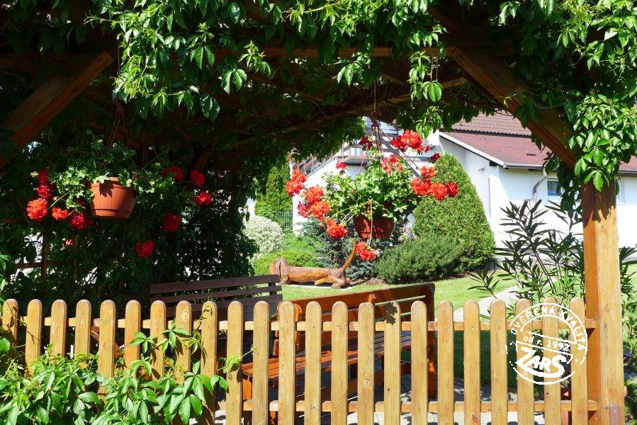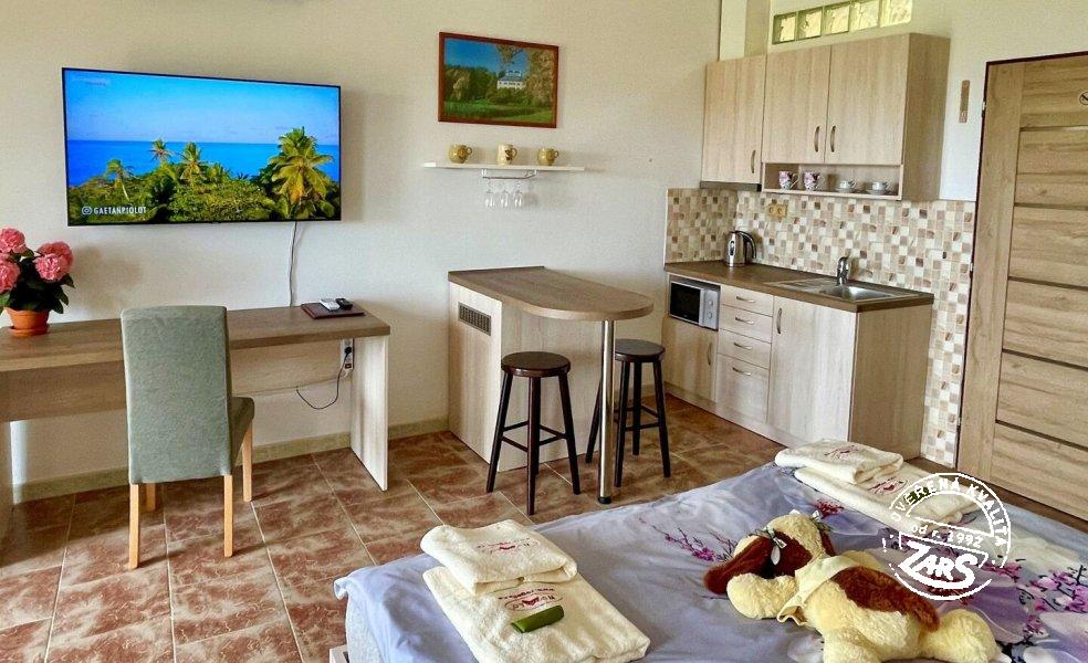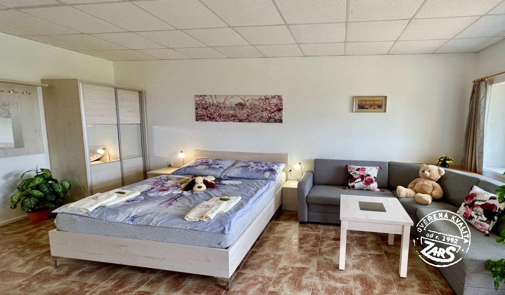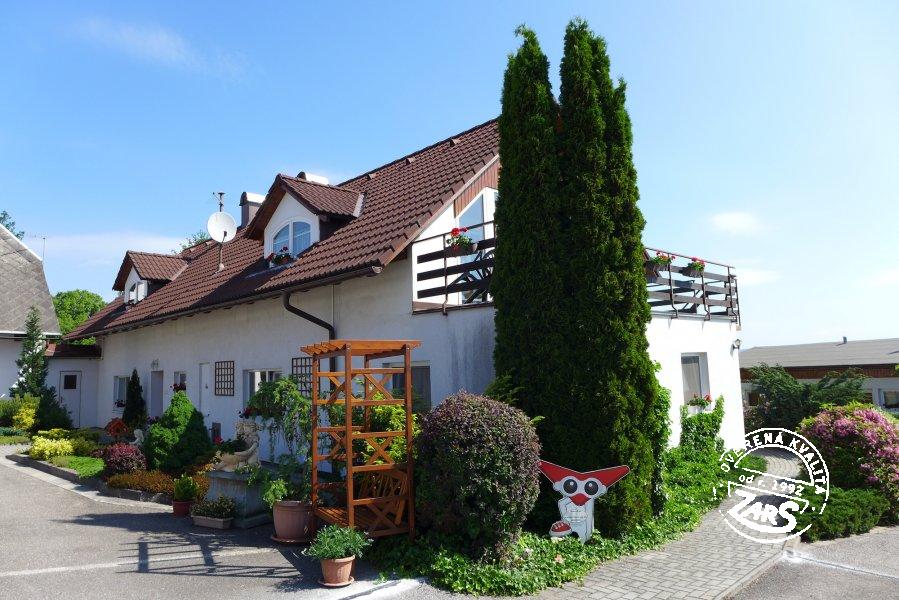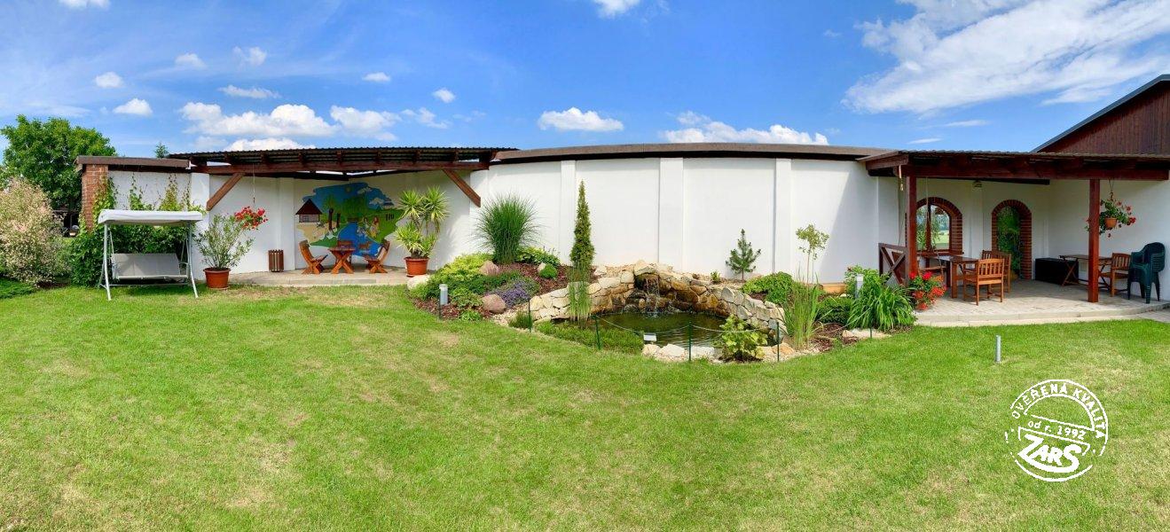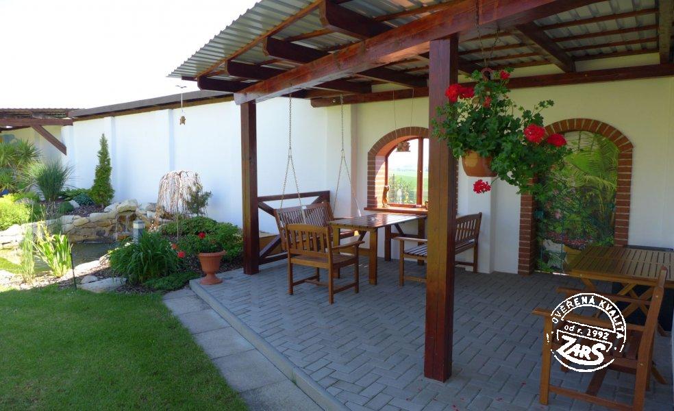 Plně vybavený pokoj pro dvě osoby s dvoulůžkem, BTV, ledničkou, varnou konvicí, koupelnou se sprchovým koutem a WC. Vytápění tepelné čerpadlo. V penzionu lze využívat služby: nekuřácké interiéry, WIFI, vinný sklípek aj. U penzionu velká zahrada, terasy s posezením, společný bazén (6 x 3 x 1,2 m) a zastřešené zahradní pergoly s ohništi, dětské hřiště.