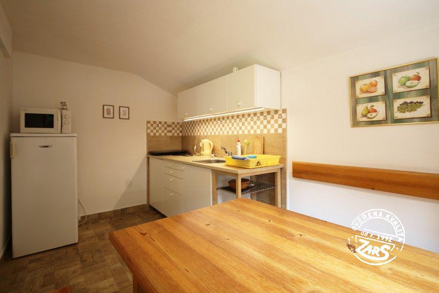 | Kuchyně: | základní nádobí pro všechny osoby samostatná teplá a studená voda samostatná kuchyňská linka el. chladnička mrazák el. vařič dvouplotýnkový varná konvice |