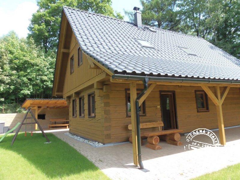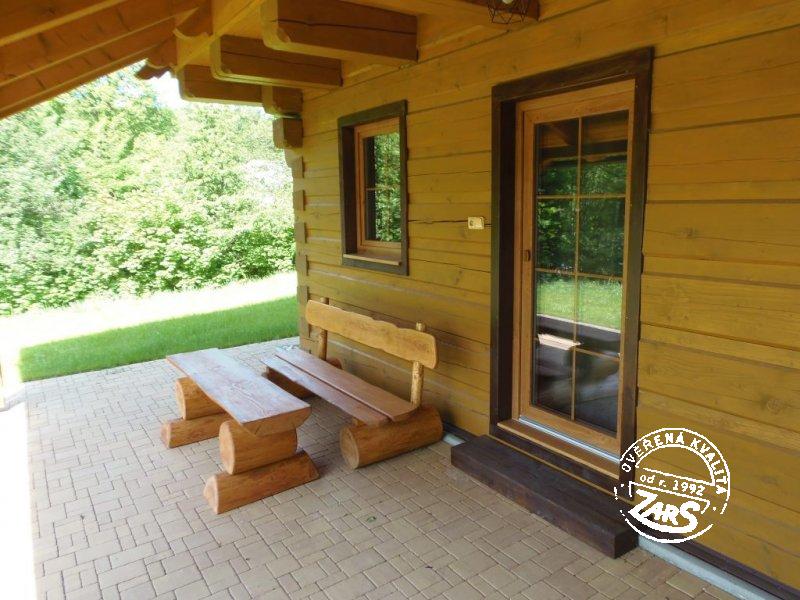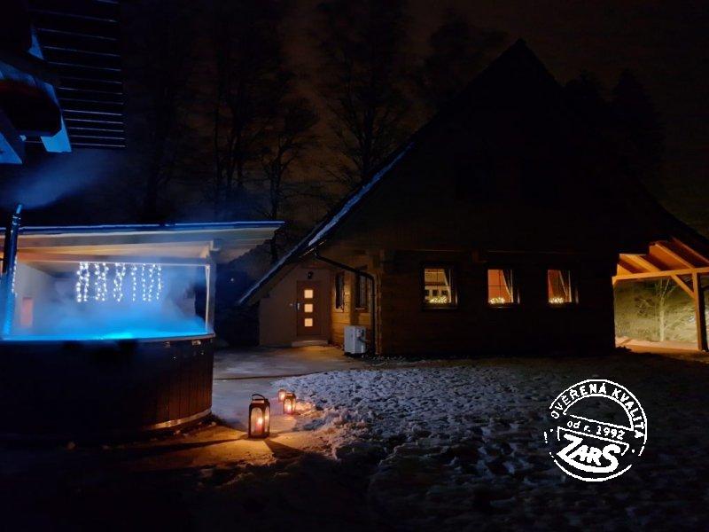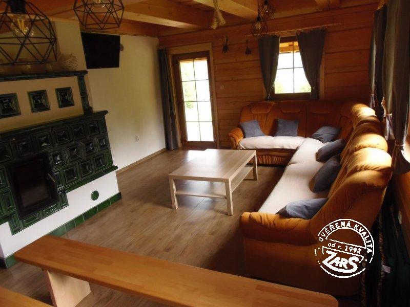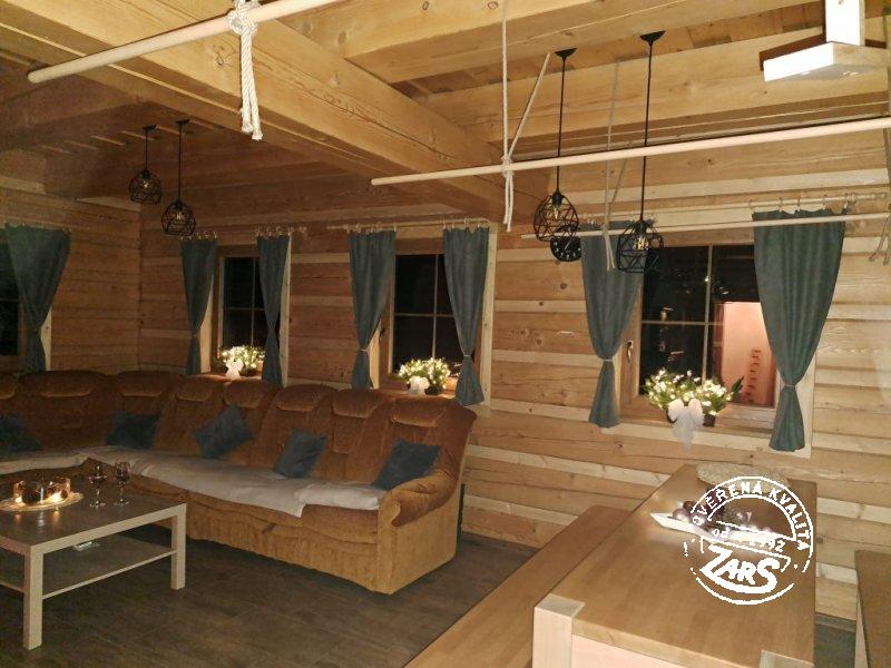 V přízemí vstupní předsíň, finská sauna, společenská místnost s kuch. koutem vybavena posezením, BTV, kachlovými kamny, jídelním posezením z masivu, kuch. kout s lednicí s mrazákem, sklokeramickou deskou, troubou, myčkou na nádobí, varnou konvicí, mikrovlnnou troubou, nádobím aj., dále 2lůžková ložnice s manželskou postelí, koupelna s vanou, umyvadlem, WC a pračkou. V patře dvě 2lůžkové ložnice (v každé dvě lůžka, který lze spojit), 6lůžková ložnice, koupelna se sprchou a umyvadlem, samostatné WC. Vytápění kachlovými kamny s rozvody, možnost dotopit el. přímotopy, tepelné čerpadlo a klimatizace, ohřev vody boilerem. U roubenka terasa s posezením 11 x 4 m, dále pergola s krbem a posezením, vinný sklípek a vyhřívaný koupací sud s hydromasáží.