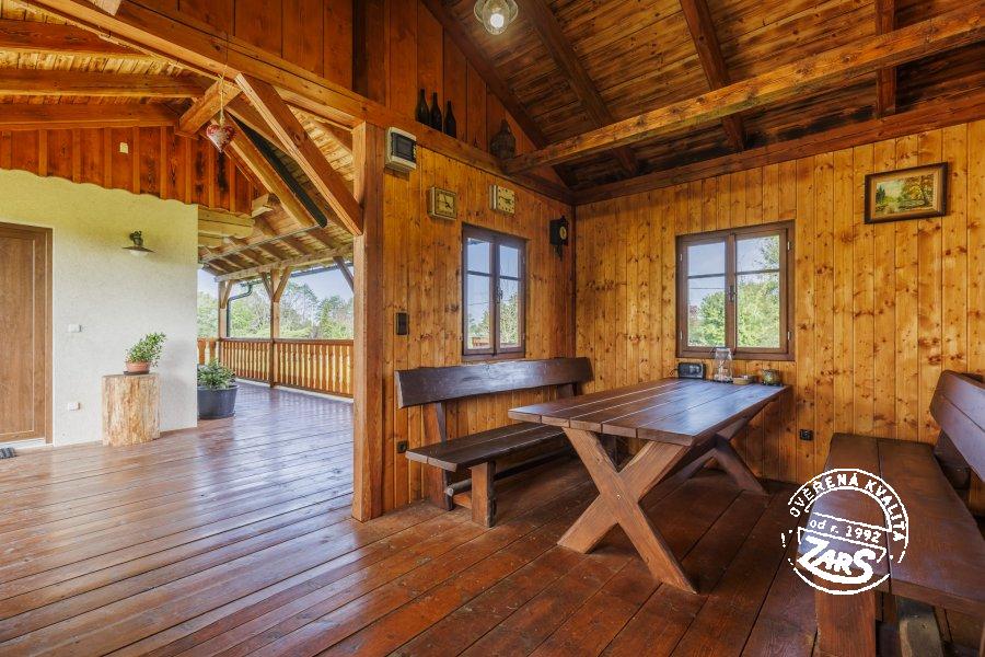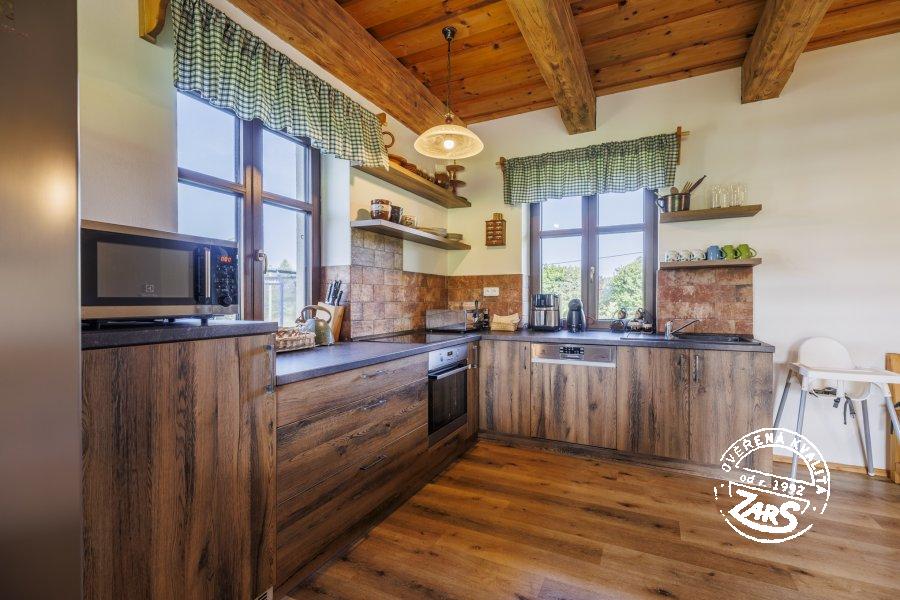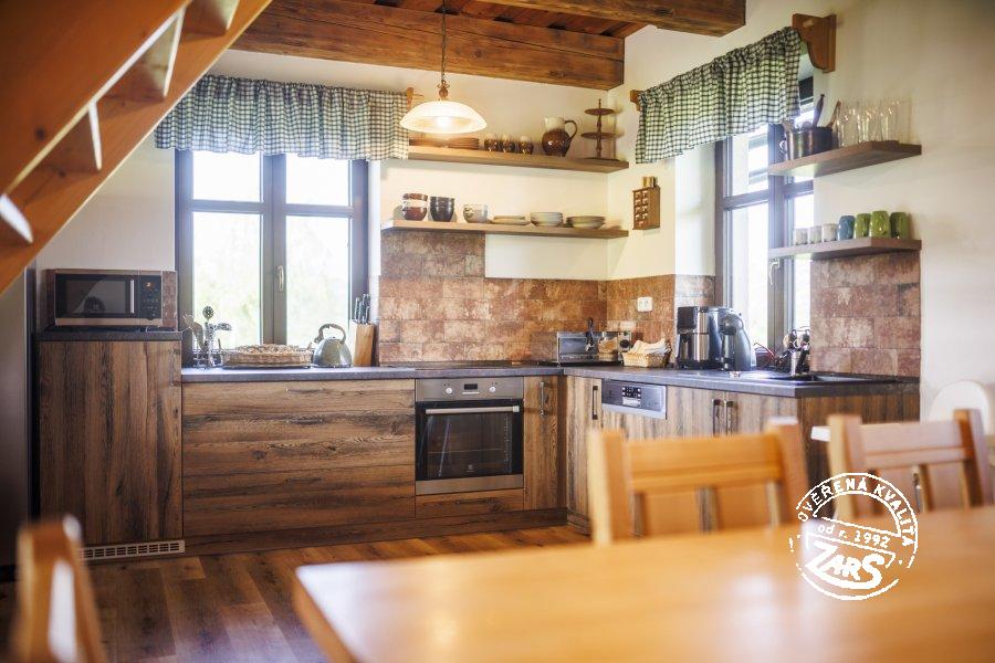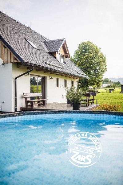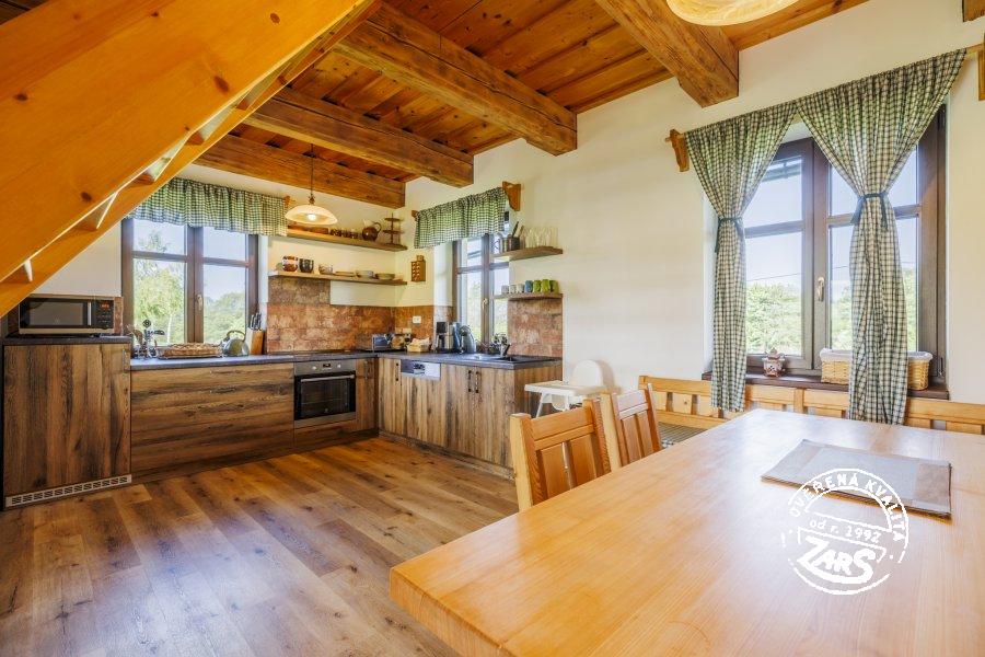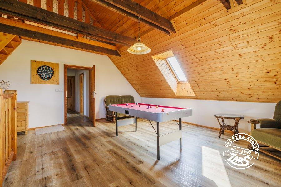 V prostorném přízemí nová vybavená kuchyň se spotřebiči včetně ledničky, myčky, trouby, sklo - keramické varné desky, kávovarem, posezením pro 12 osob aj., kuchyně je propojená se společenskou místností s posezením a LED TV, vstupem na venkovní terasu přes francouzské dveře. Dále v přízemí 3lůžková ložnice, koupelna se 2 sprchami, samostatné WC, infrasauna. V patře dvě 2lůžkové ložnice (jedna průchozí) a 3lůžková ložnice, koupelna se sprchovým koutem, umyvadlem a WC. Dále v patře k dispozici herna (kulečník, šipky, odpočinková zóna). V podkroví 2lůžková ložnice - otevřený prostor nad schodištěm, 2 matrace. Vytápění objektu elekrické- podlahové, radiátory, ohřev vody boilerem. U chalupy nadzemní bazén prům. 4.88m - vyhřívaný, vyhřívaný koupací sud, plážová lehátka, slunečník, dětské hřiště - pískoviště, houpačky, ruské kuželky, trampolína. hračky, líný tenis, petanque, možnost inline brusle před chalupou, venkovní posezení na terase a u ohniště, k dispozici gril, udírna a ohniště.
