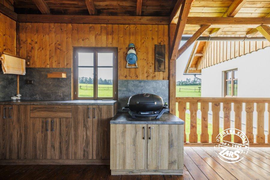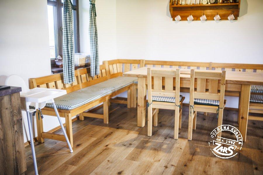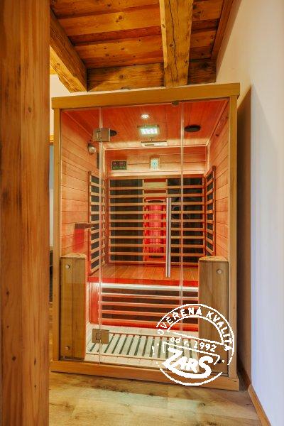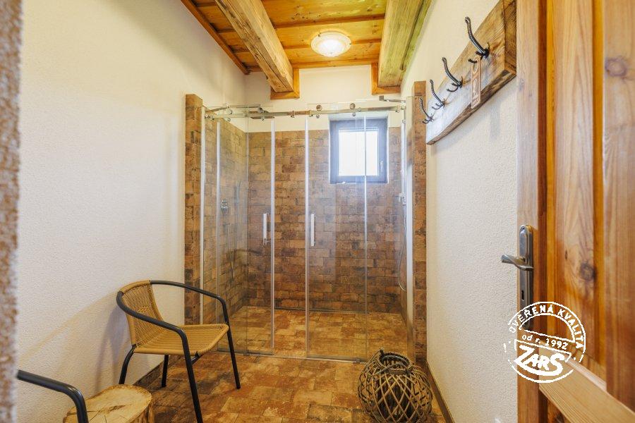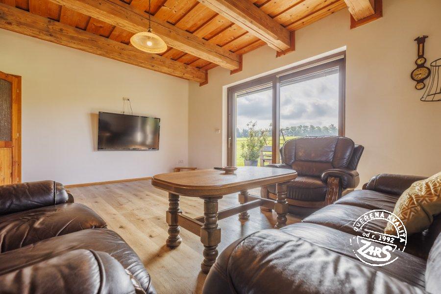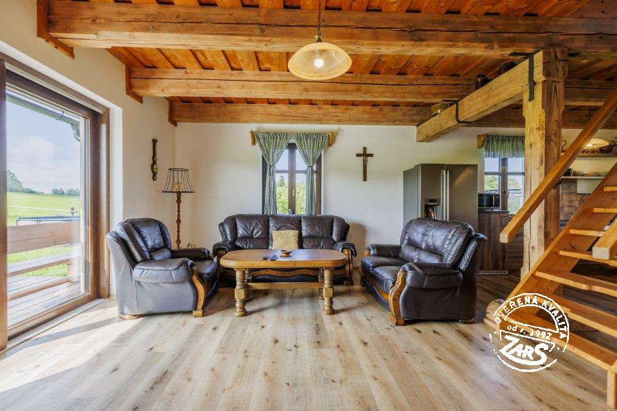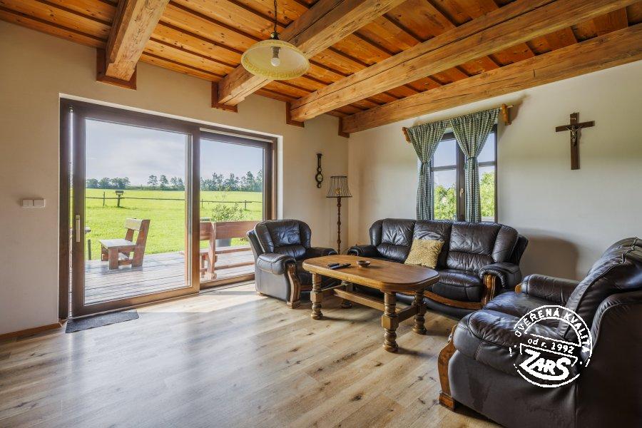 V prostorném přízemí nová vybavená kuchyň se spotřebiči včetně ledničky, myčky, trouby, sklo - keramické varné desky, kávovarem, posezením pro 12 osob aj., kuchyně je propojená se společenskou místností s posezením a LED TV, vstupem na venkovní terasu přes francouzské dveře. Dále v přízemí 3lůžková ložnice, koupelna se 2 sprchami, samostatné WC, infrasauna. V patře dvě 2lůžkové ložnice (jedna průchozí) a 3lůžková ložnice, koupelna se sprchovým koutem, umyvadlem a WC. Dále v patře k dispozici herna (kulečník, šipky, odpočinková zóna). V podkroví 2lůžková ložnice - otevřený prostor nad schodištěm, 2 matrace. Vytápění objektu elekrické- podlahové, radiátory, ohřev vody boilerem. U chalupy nadzemní bazén prům. 4.88m - vyhřívaný, vyhřívaný koupací sud, plážová lehátka, slunečník, dětské hřiště - pískoviště, houpačky, ruské kuželky, trampolína. hračky, líný tenis, petanque, možnost inline brusle před chalupou, venkovní posezení na terase a u ohniště, k dispozici gril, udírna a ohniště.