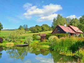 'description' => 'Celoroční ubytování ve stylově zrekonstruované poloroubené chalupě s bazénem a vlastním rybníkem pro 16 osob + dětská postýlka. K dispozici 5 ložnic, 3x koupelna s WC. U chalupy nadzemní vyhřívaný bazén venkovní posezení, gril, ohniště aj.',
