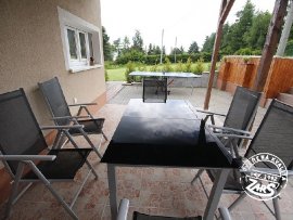 'text_equipment' => '<p>V přízemí k dispozici společenská místnost s multifunkčním hracím stolem. se sat. BTV, sedací soupravou, rádiem, krbem a jídelním koutem, dále samostatná kuchyně vybavena el. chladničkou s mrazničkou, mikrovlnnou troubou, el. sporákem, toustovačem, překapávačem, varnou konvicí, nádobím aj., fitness s vířivkou, masážním el. křeslem, infrasaunou a posilovacím náčiním. Dále koupelna se sprchovým masážním boxem, umyvadlem a WC. V patře tři 2lůžkové ložnice, jedna s svoulůžkem, dvě se samostatnými lůžky. Vytápění el. přímotopy a krbové, ohřev vody boilerem. U chaty terasa o rozloze 23m2 se zahradním nábytkem. Na zahradě vyhřívaný bazén (8x4x1,2m) s lehátky na opalování, provoz bazénu od května do září, pinpongový stůl, gril a ohniště, nově multifunkční hrací stůl.</p>',