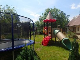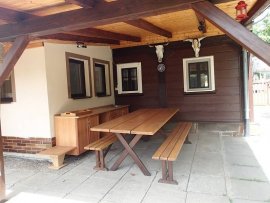 'text_equipment' => '<p>Chalupa je určena rodinám s dětmi, proto je v celém objektu zákaz kouření, stejně tak není možné ubytovávat zvířata. Chalupa se skládá ze dvou objektů – roubenky a domečku, velké oplocené zahrady s dětským hřištěm - pronajímá se jako celek. Roubenka je vybavena 4lůžkovým a 6lůžkovým pokojem, dále velká společenská místnost (jídelna) s hernou pro děti a sat.BTV, kompletně vybavena kuchyň, koupelna se sprchou, umyvadlem, WC. Domek je vybaven malou vybavenou kuchyňkou, dvě 3lůžkové ložnice a koupelna se sprchou, umyvadlem a WC. V patře společenská místnost se 3 lůžky, dva 2lůžkové pokoje, koupelna se sprchou a umyvadlem, WC. Vytápění plynové, ohřev vody plynový a elektrický. Na zahradě dětské hřiště pro děti od 2 - 12 let, houpačky, trampolína, stůl na stolní tenis, kruhový bazén, venkovní kryté posezení před roubenkou i domečkem. K dispozici velký vysoce kvalitním plynový gril, klasický gril a udírna. Možnost zapůjčení pípy. </p>',