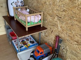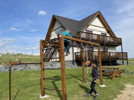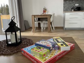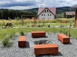 Apartmán v přízemí s vlastním vchodem vybaven obývacím pokojem s posezením (lze využít jako 1 přistýlku), BTV, jídelním posezením a kuch. koutem vybaveným el. varnou deskou, mikrovlnnou troubou, kávovarem, toustovačem, lednicí s mrazákem, nádobím aj., dále 4lůžková ložnice, koupelna se sprchovým koutem, umyvadlem a WC. Apartmán je vytápěn podlahovým topením, tepelný komfort zvyšuje i samotná dřevostavba. Ohřev vody boilerem. Nová zahrada nabízí vyžití pro děti i dospělé: posezení s grilem, ohniště, senzomotorický chodník, houpačka, workoutová prolézačka, hraní nebo opalování. Každý apartmán má v chodbě vlastní vysoušeč lyžařských bot.