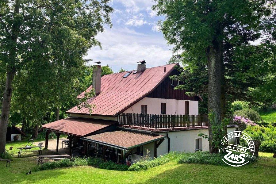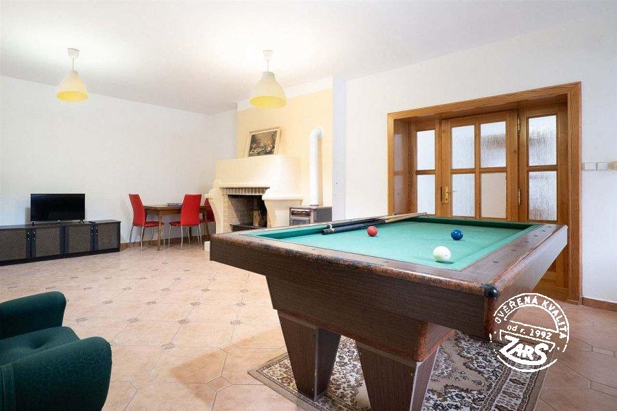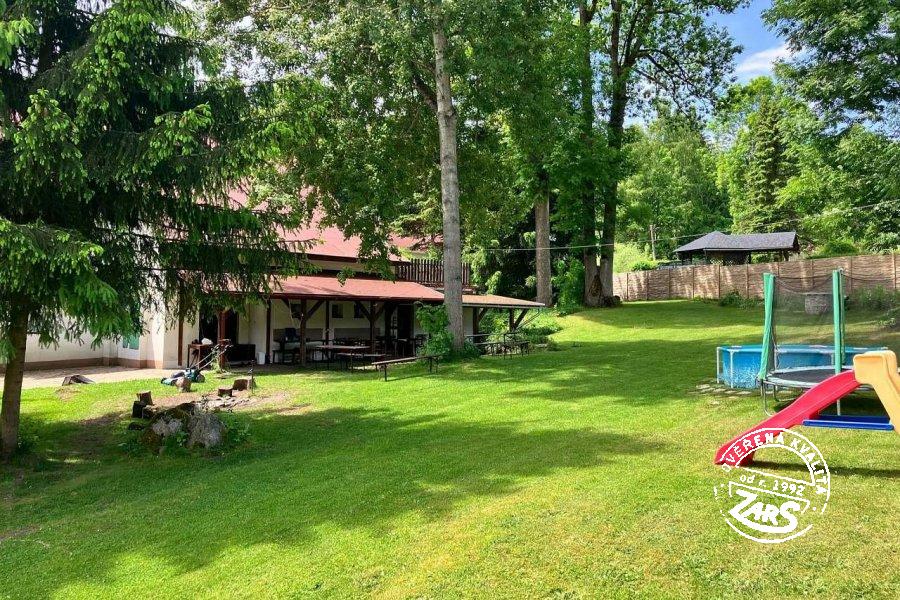 Rekr. dům nabízí ubytování pro 20 osob, ideálně pro rodiny s dětmi a spřátelené skupiny. V přízemí dvě 2lůžkové ložnice, dvě společenské místnosti s krbem, posezením a TV, kulečník. K dispozici jsou také dvě plně vybavené kuchyně s elektrickým sporákem, lednicí, mrazákem, mikrovlnnou troubou, rychlovarnou konvicí a myčkou na nádobí, nádobím aj. V prvním patře společenská místnost se 3 přistýlkama a 2lůžková ložnice. Ve druhém patře tři ložnice, 3, 4 a 4lůžková. Pro děti je připraven dětský koutek. K dispozici tři koupelny se sprchou, umyvadlem a WC, a další dvě koupelny s umyvadlem, sprchou, vanou a WC. K výbavě patří také infrasauna pro příjemné relaxování. Vytápění objektu el. topením a krbem, ohřev vody boilerem. Parkování pro 8 aut je k dispozici u chalupy. Na zahradě najdete venkovní posezení na kryté terase, gril, dva venkovní bazény, pro děti trampolínu, houpačku. Zcela jistě oceníte velkou zahradu o rozloze 2000 m², která nabízí dostatek prostoru pro hraní míčových her a další aktivity.