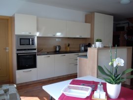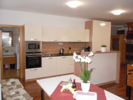 Apartmán v prvním patře a v podkroví s infrasaunou zdarma se samostatným vstupem ze společné chodby domu. Apartmán je vybaven v patře kuch. koutem s lednicí s mrazákem, sklokeramickou deskou, el. troubou, mikrovlnnou troubou, myčkou na nádobí, topinkovačem, rychlovarnou konvicí, nádobím aj.,kuchyňský kout je spojen s prostornou jídelnou se stolem a lavicemi a obytnou společenskou místností s rozkládací rohovou sedací soupravou, LCD TV a minibarem. Součástí místnosti je i fotbálek, a šipky pro dospělé i pro děti. Koupelna se sprchovým koutem, umyvadlem, pračkou a WC. V podkroví 2lůžková průchozí ložnice s možností 2 přistýlek a 4lůžková ložnice. V případě potřeby je k dispozici na vyžádání zdarma dětská polohovací jídelní židlička, přebalovací pult s vaničkou a za poplatek dětská postýlka. Součástí apartmanového domu je relaxační wellness zóna, která je zpoplatněna a najdete zde whirlpool vanu pro 5 osob, finskou saunu, carbonovou infrasaunu, kneipův chodník, vyhřívanou lavici, ochlazovací sud i ledové vědro. U apartmánu společná venkovní terasa s krbem a grilem, ruské kuželky, a dále společenské hry, soft tenis, šipky. Vytápění je centrální, ohřev vody boilerem.