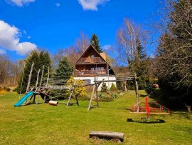 Chata v podmanivé horské krajině, s velkou zahradou a bazénem. Impozantní podkrkonošské výhledy, čistý vzduch. Zahrada poskytuje veškerý komfort, který potřebujete: posezení, altánek, houpačku, gril, ohniště, pískoviště a klouzačku. V přízemí chaty najdete hernu se stolním tenisem. Vynikající dovolená pro rodinu s dětmi. Okolní přírodu poznáte nejlépe díky rozmanitým výletům. V okruhu cca 10 kilometrů koupání, jízda na koni, tenis, rybaření. Rozhodně navštivte ZOO Dvůr...